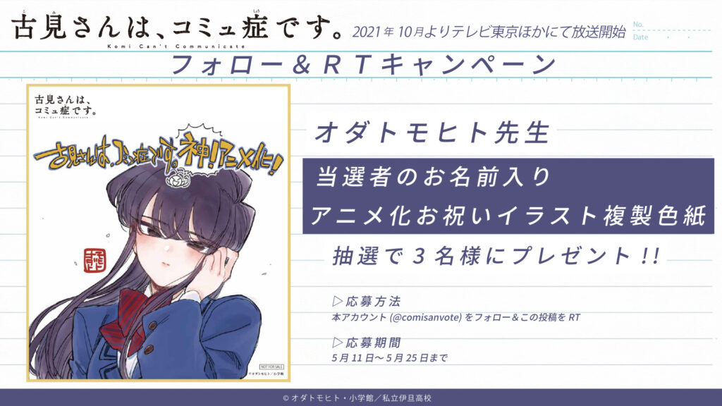 そして公式Twitter(@comisanvote)にて、本イラストを使用した複製色紙が当たるフォロー&リツイートキャンペーンを実施します。